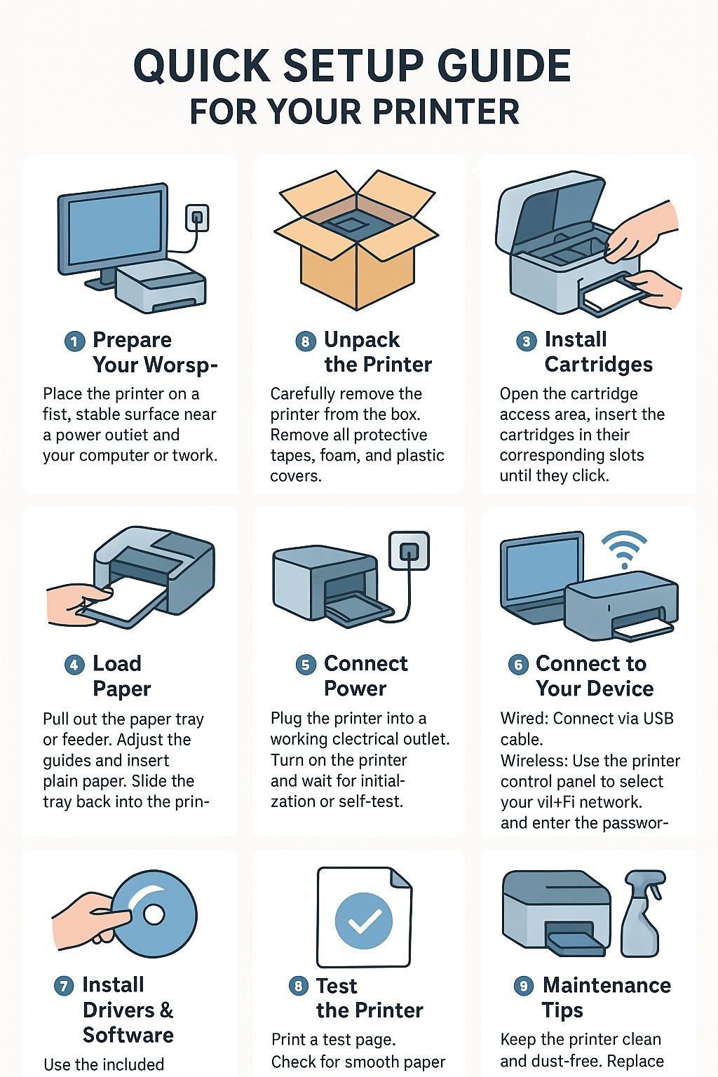📏 Ensure there’s enough space around the printer for ventilation and paper movement.